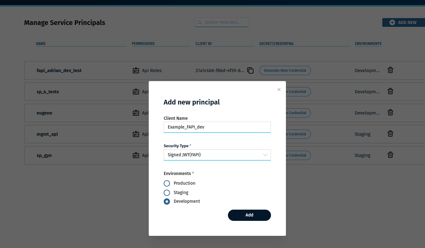 “Manage Service Principals” screen in the “Secure” module of Integration Manager.