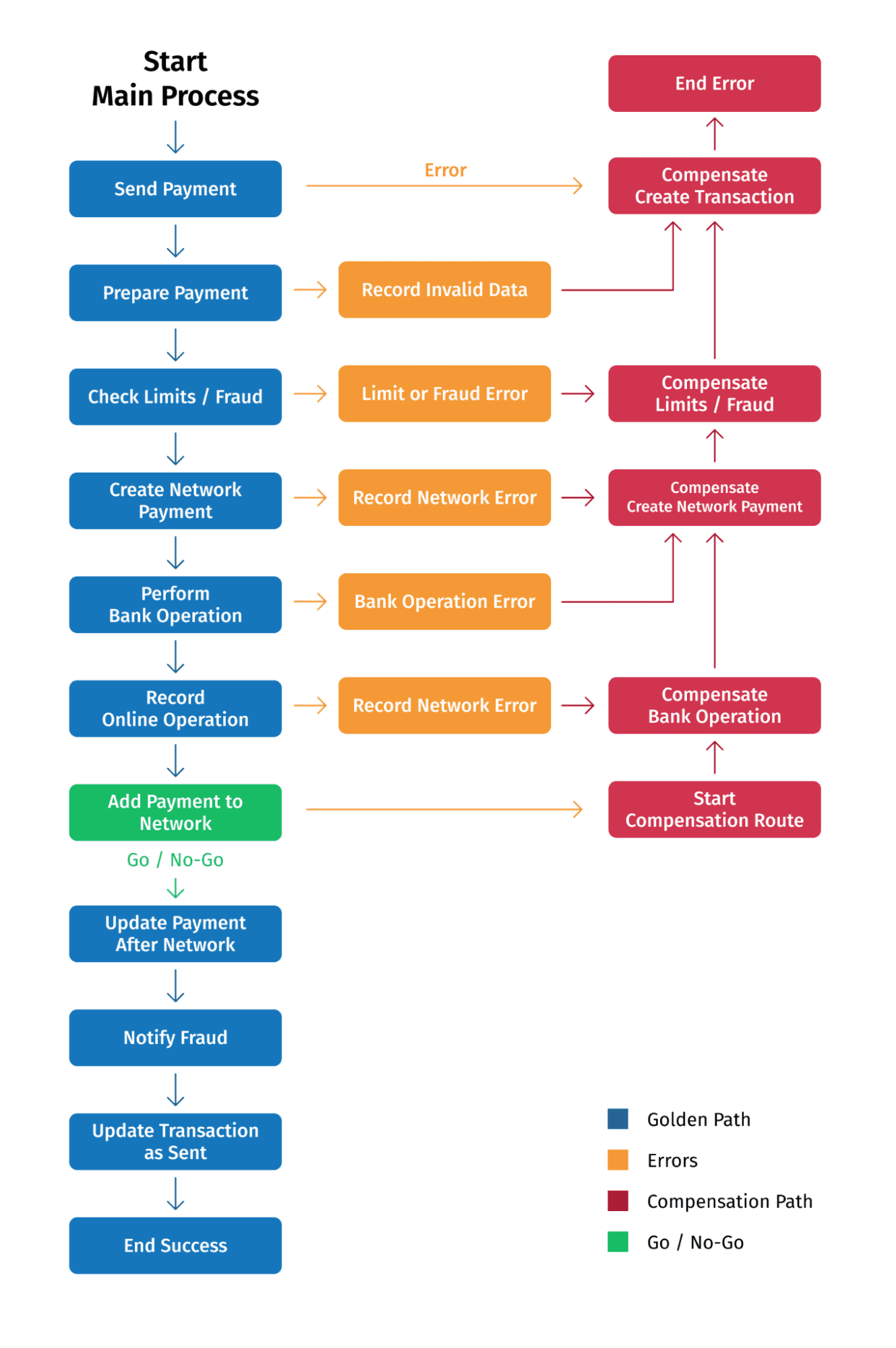 In our process, there is a go/no-go point that represents the “Add payment to the Payment Network” step. If that step succeeds, the process must progress forward to complete the subsequent steps and the payment cannot be canceled if there’s an error beyond that point. If the go/no-go step fails, the previous steps must be undone. These compensating actions are also atomic steps and will be retried until it is successful.