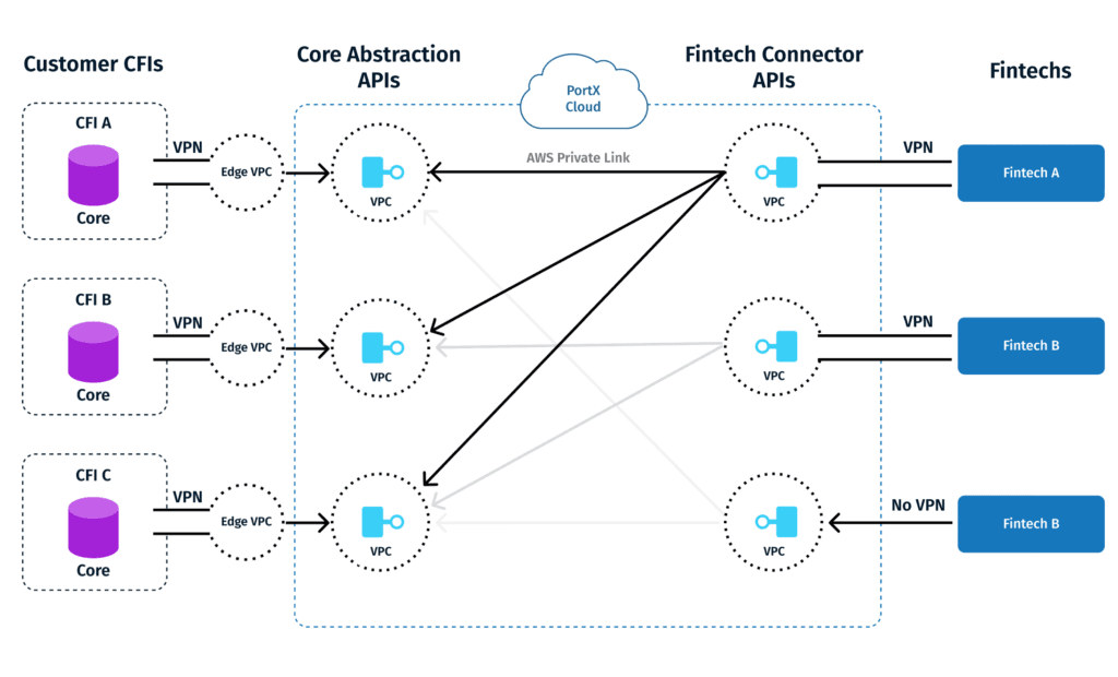 The big idea: PrivateLink provides complete control and privacy to securely connect the VPC-protected API of a fintech with its CFI customer (or multiple customers) without exposing traffic to the public internet or other networks on the PortX platform.
